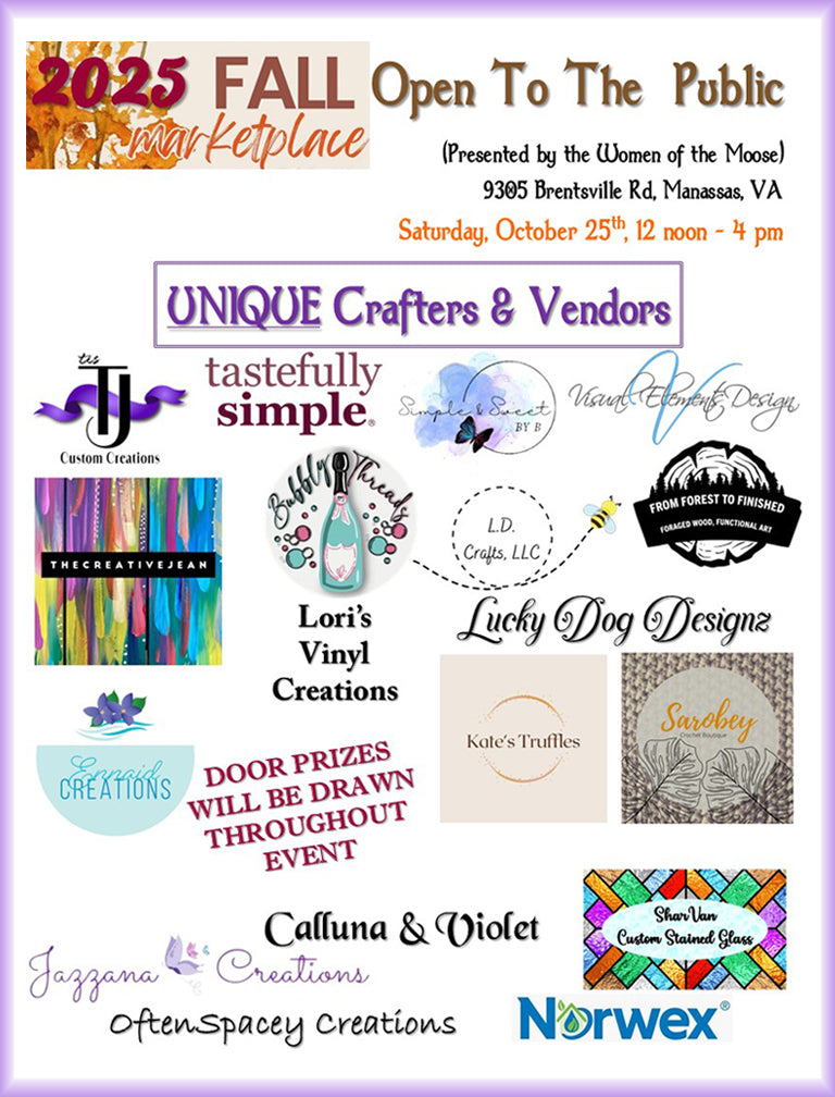 Our Fall Marketplace, hosted by the Women of the Moose, Manassas, is back! Join us for a fabulous afternoon and explore a variety of creative vendors. Door prizes will be drawn throughout the event! Bring your friends - ALL ARE WELCOME!